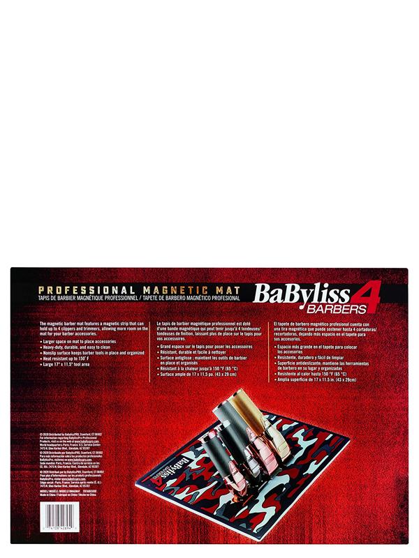 The BaByliss Professional Magnetic Barber Mat features a magnetic strip that can hold up to 4 clippers and trimmers, standing up, allowing more room on the mat for your barber accessories